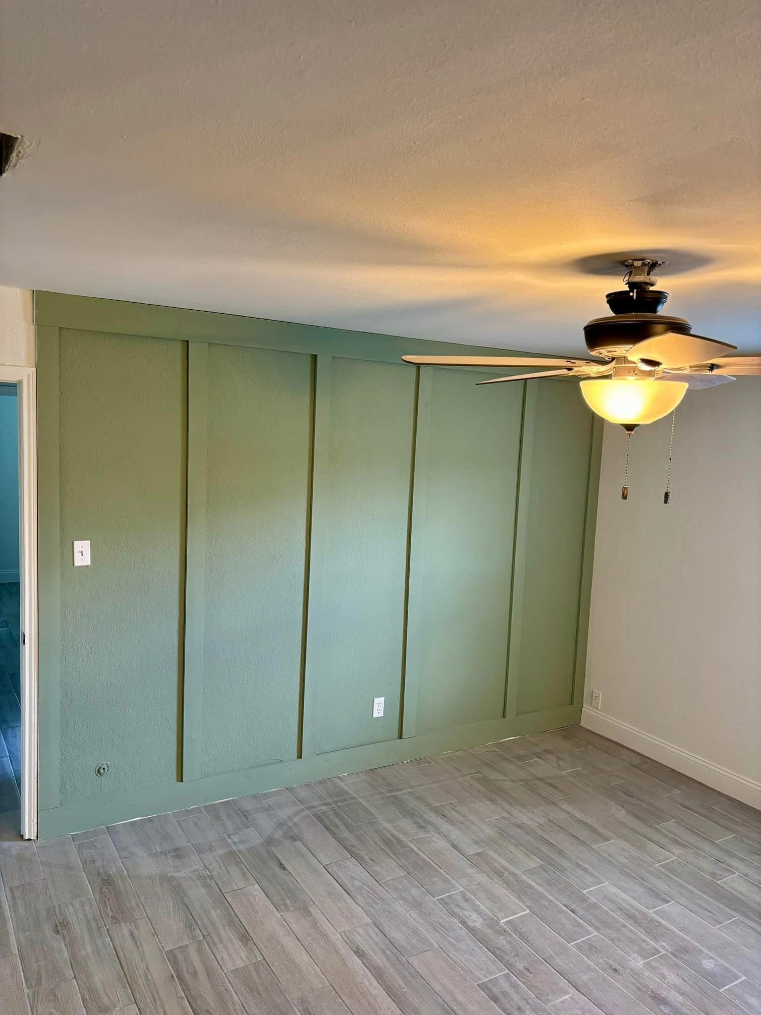Add style and sophistication to your home with a custom accent wall by Jimenez & Sons Construction. This design features clean vertical trim work paired with a soft, modern green finish that brings warmth and character to the room.